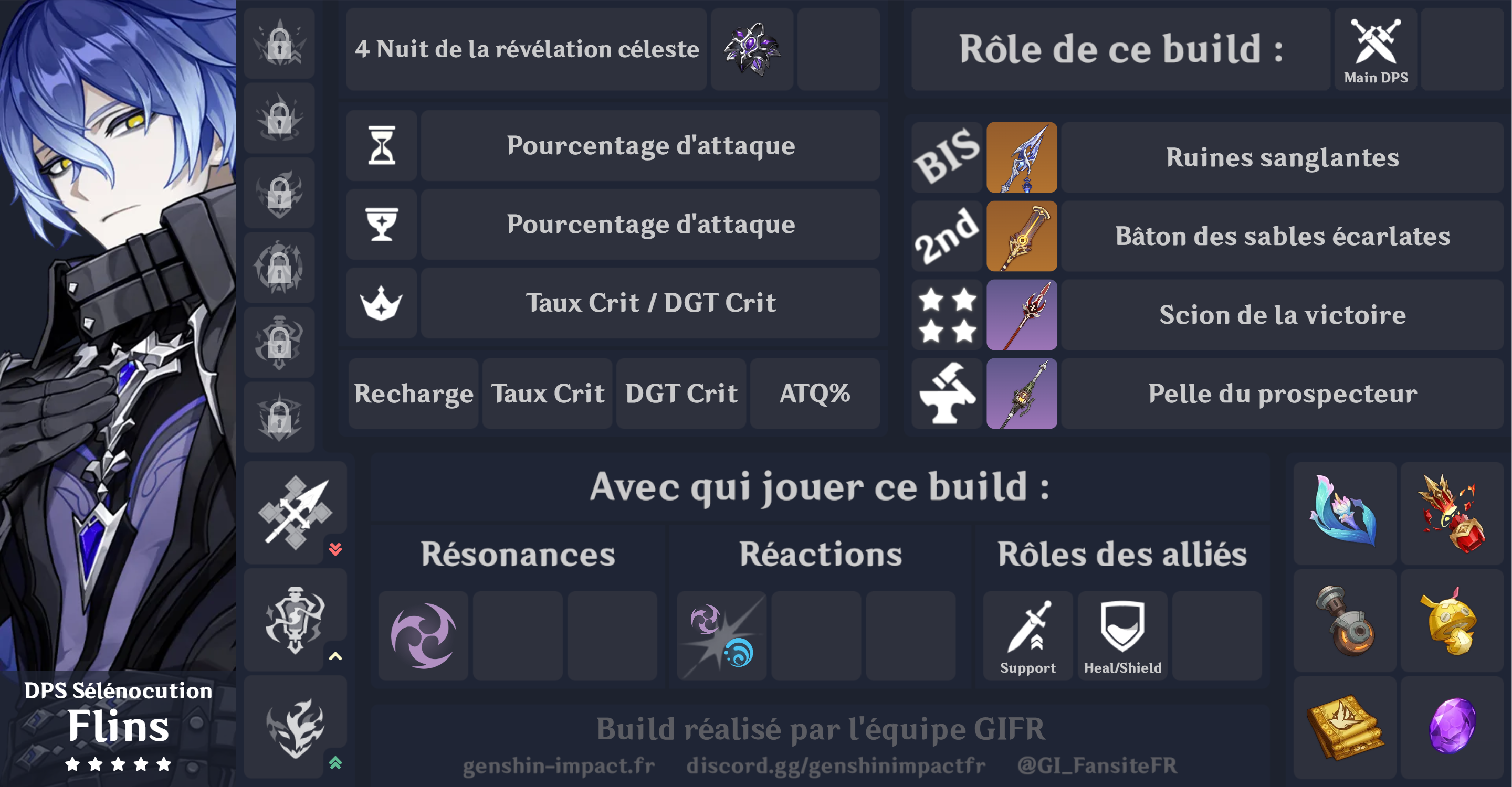 Le seul set d’artéfacts vraiment intéressant pour Flins est « Nuit de la révélation céleste », et il faudra donc prendre en compte les 30 % de Taux critique qu’il apporte pour ne pas dépasser les 100 %.