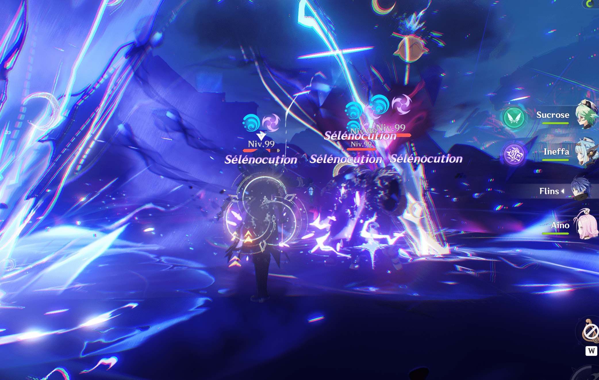 Lorsqu’une attaque inflige des dégâts de Sélénocution, elleignore la défensedes ennemis comme la plupart des réactions élémentaires. Si cette attaque n’estpas issue d’une réactionde Sélénocution, comme c’est le cas des déchaînements élémentaires de Flins, ses dégâts sont égalementmultipliés par 3.