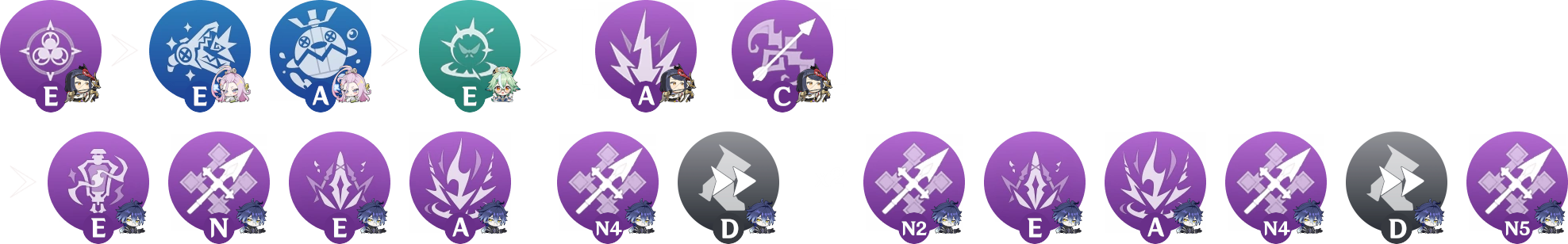 Si l’équipe génère suffisamment d’énergie, Flins peut se permettre d’utiliser son déchaînement normal au début de son combo en plus des deux déchaînements alternatifs. Il ne pourra cependant pas le faire à chaque rotation car cela demanderait bien trop de Recharge d’énergie, mais il est envisageable de le faire une rotation sur deux ou trois.