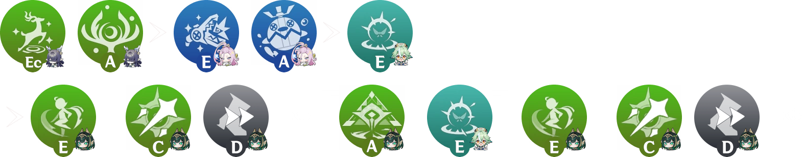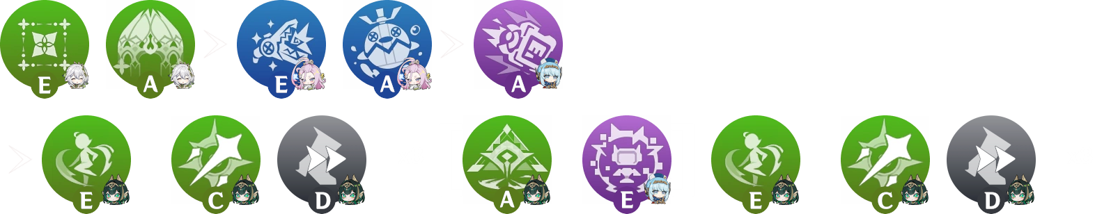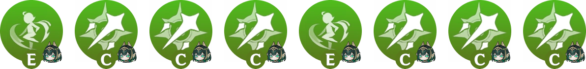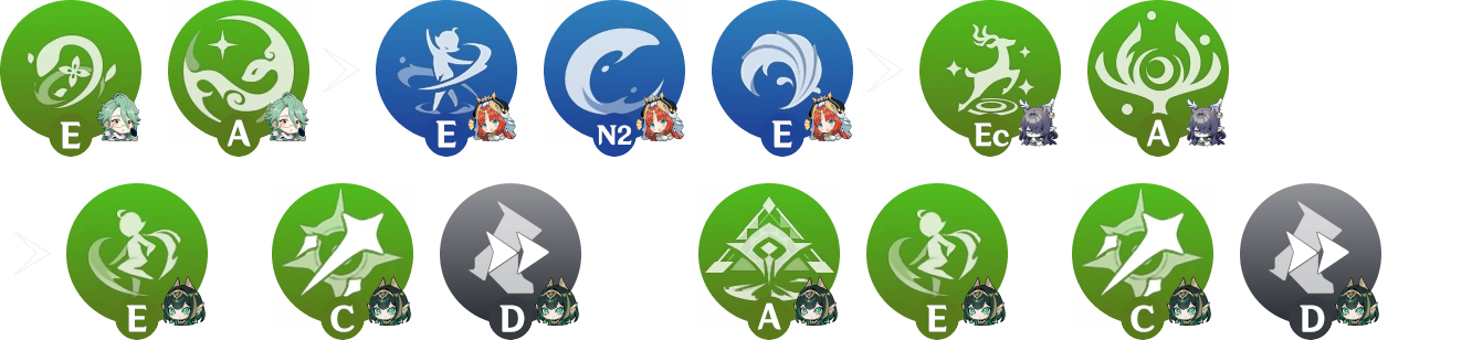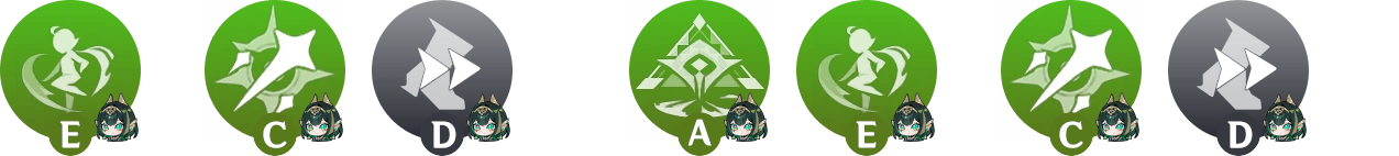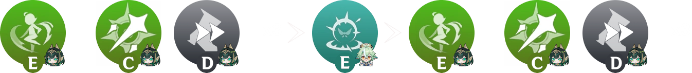 Utiliser une aptitude avec un support avant la 2e compétence de Nefer afin de rafraichir sa durée ou de générer de l’énergie. Celles qui en bénéficient le plus sont la compétence de Sucrose, le déchaînement de Kokomi, ainsi que la compétence ou le déchaînement de Fischl.