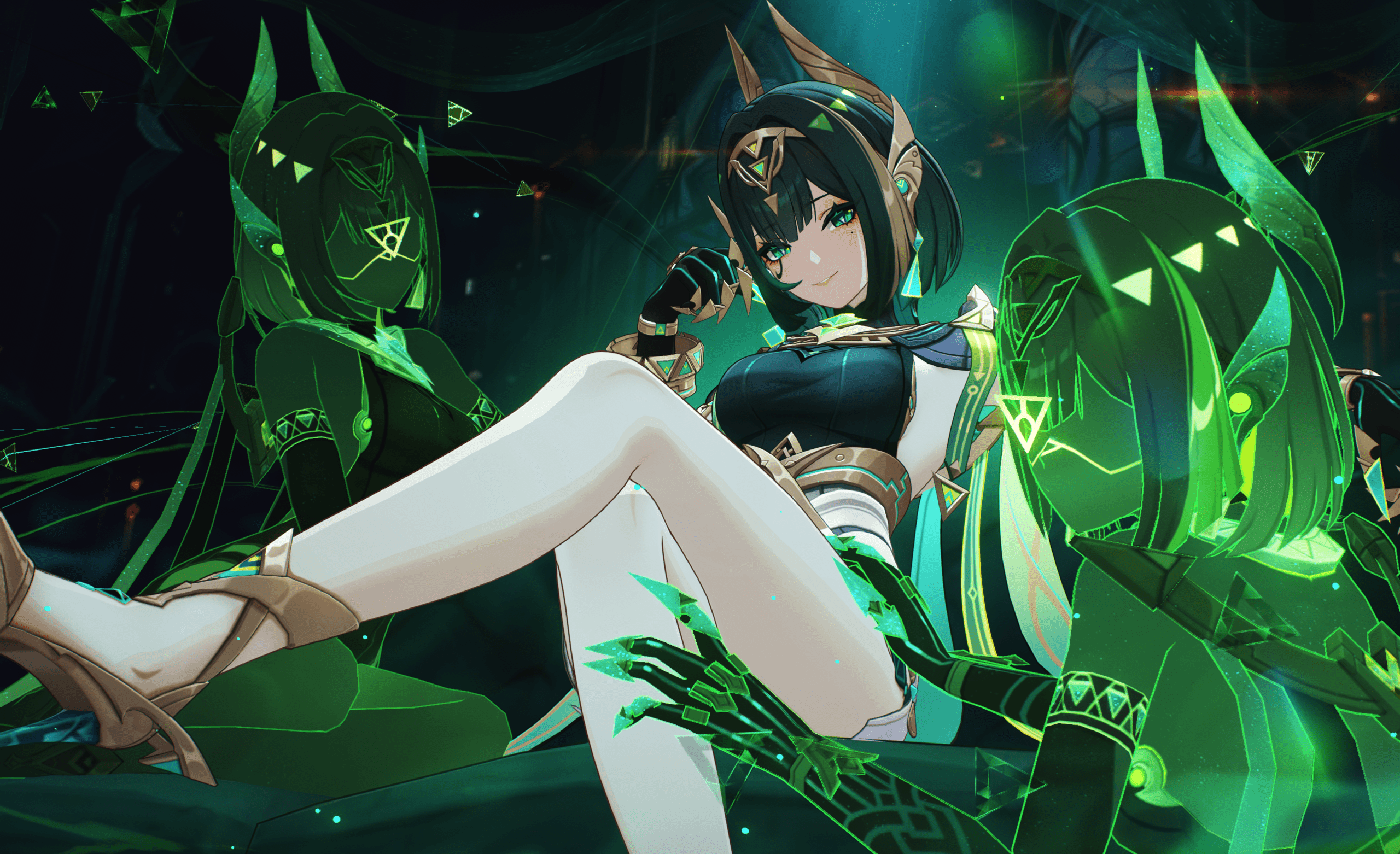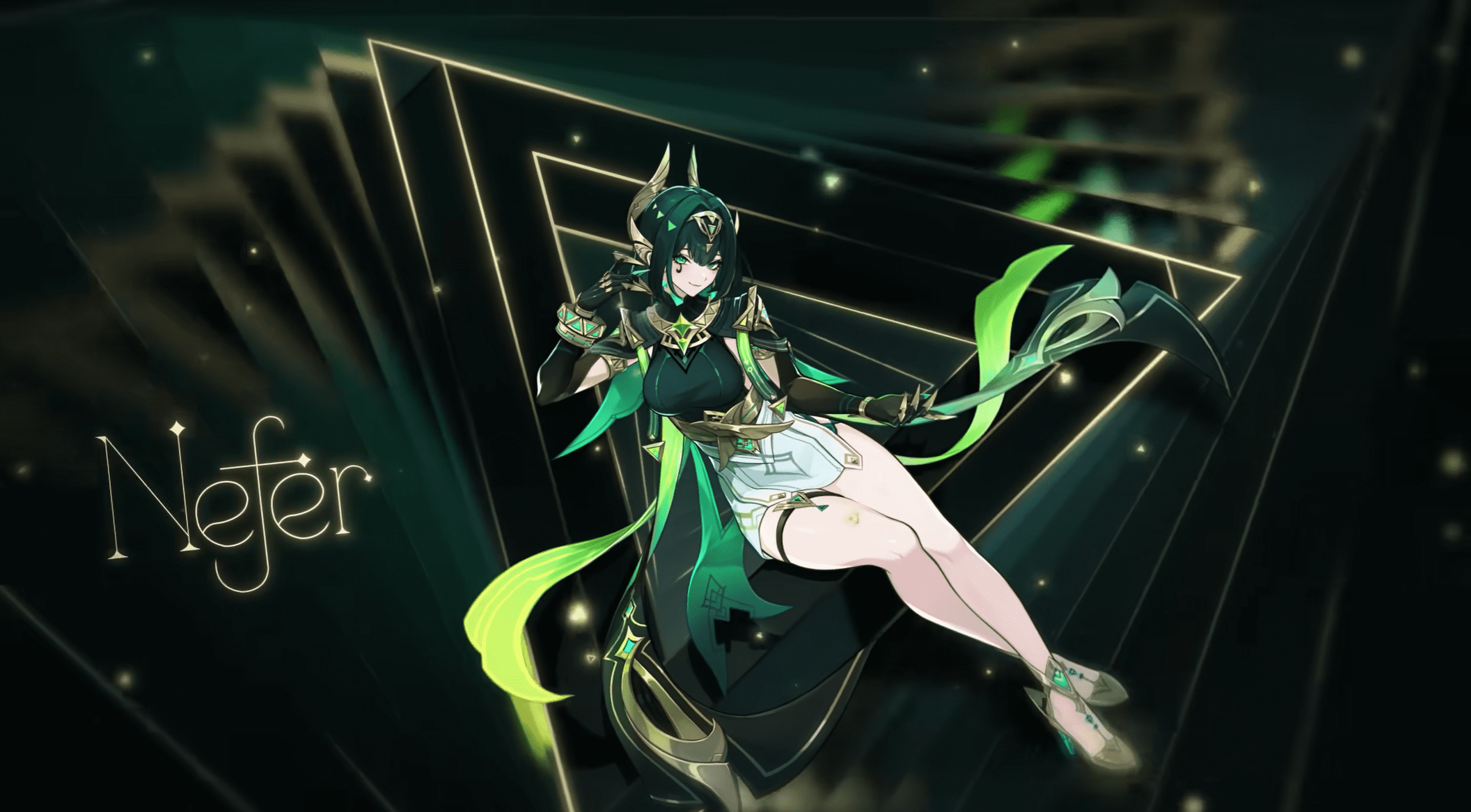 Lorsque Nefer est dans l'état Danse d'ombre, sa locomotion serpentine accorde de la rosée verdoyante supplémentaire à l'équipe pendant 5 s après qu'un personnage de l'équipe déclenche une réaction de Sélénofleurissement. Chaque tranche de 100 pts de maîtrise élémentaire au-delà de 500 pts renforce cet effet de 10 %, jusqu'à un maximum de 50 %.