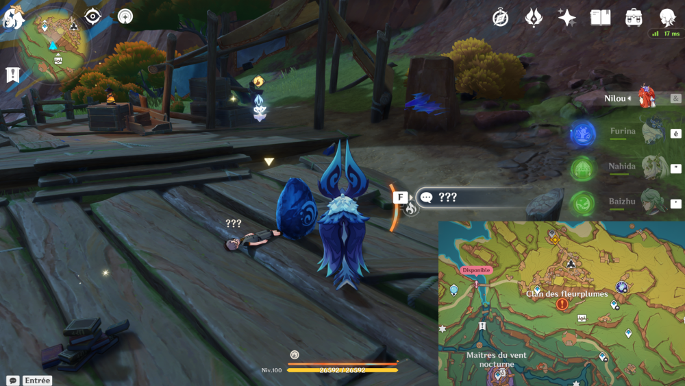 Pour débuter cette série de quêtes, rendez-vous à l’endroit indiqué ci-dessous. Vous y trouverez un PNJ à terre : utilisez les pouvoirs de spiritoraison sur le graffiti à proximité pour faire apparaitre une pierre Hydro. Frappez-la pour aider le garçon à aller mieux.