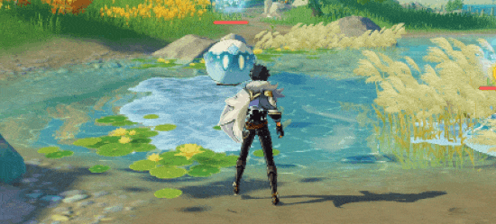 La réaction élémentaire Gel se produit si les éléments Cryo et Hydro entrent en contact l’un avec l’autre. Les créatures gelées restent immobiles. En attaquant les ennemis gelés avec un espadon ou des dégâts Géo, la glace se brisera et infligera des dégâts physique supplémentaires.