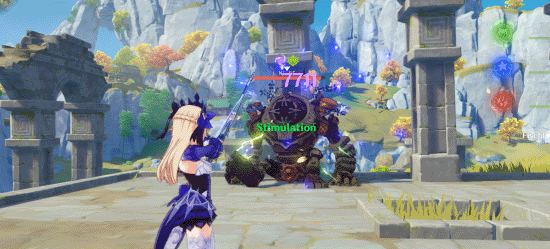 La Stimulation survient lorsque les éléments Électro et Dendro entrent en contact. C’est une réaction qui ne fait pas de dégât mais applique l’état “Stimulé”, qui est à la base des réactions Propagation et Suractivation et maintient l’élément Dendro sur la cible affectée.