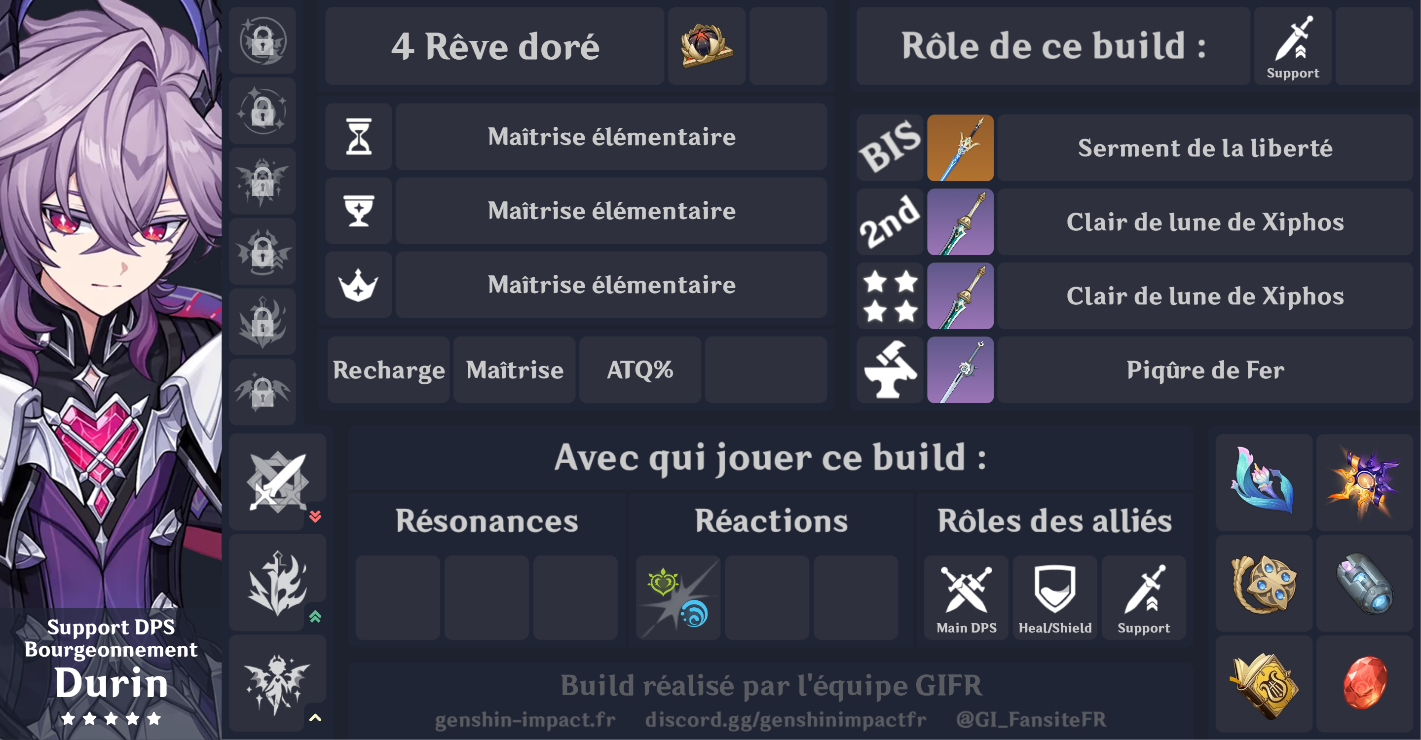 | Constellation #1 Rédemption de l'adamah | Déclencher un déchaînement élémentaire provoque divers effets en fonction du type de déchaînement élémentaire que Durin déclenche : Principe de pureté : Comme la lumière qui fluctue : tous les autres personnages de l'équipe à proximité obtiennent 20 cumuls de cycle d'illumination pendant 20 s. Lorsque le personnage déployé inflige des DGT avec une attaque normale, une attaque chargée, une attaque plongeante, une compétence élémentaire ou un déchaînement élémentaire, il consomme 1 cumul de cycle d'illumination pour augmenter les DGT infligés d'une valeur équivalant à 60 % de l'ATQ de Durin. Le compte de cumuls des personnages de l'équipe possédant du cycle d'illumination est géré individuellement. Principe de ténèbre : Comme les étoiles qui brûlent : Durin obtient 20 cumuls de cycle d'illumination pendant 20 s. Lorsque Durin inflige des DGT avec un déchaînement élémentaire, il consomme 2 cumuls de cycle d'illumination pour augmenter les DGT infligés d'une valeur équivalant à 150 % de l'ATQ de Durin. Lorsqu'un déchaînement élémentaire est utilisé, les cumuls de cycle d'illumination sont réinitialisés. |