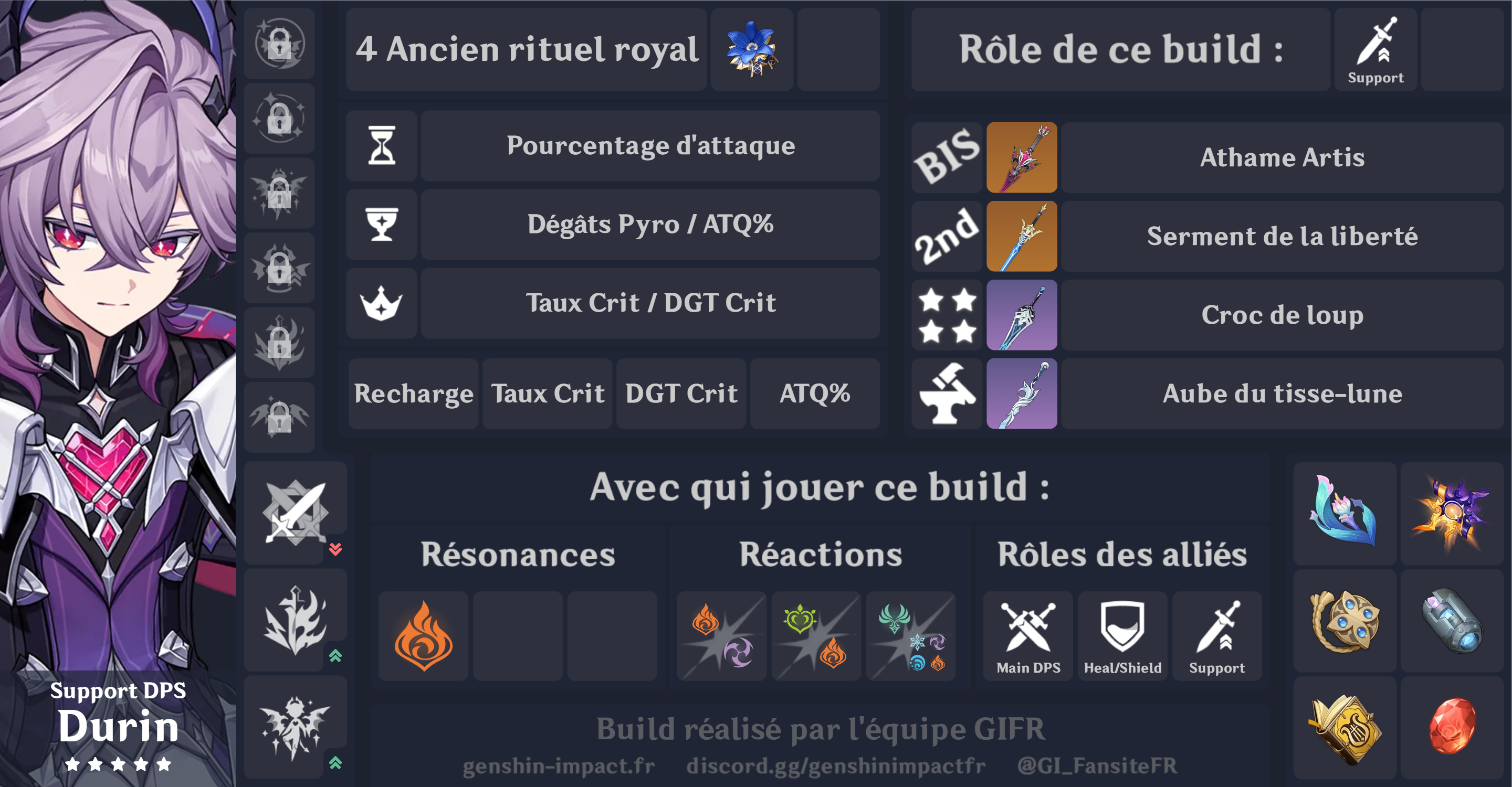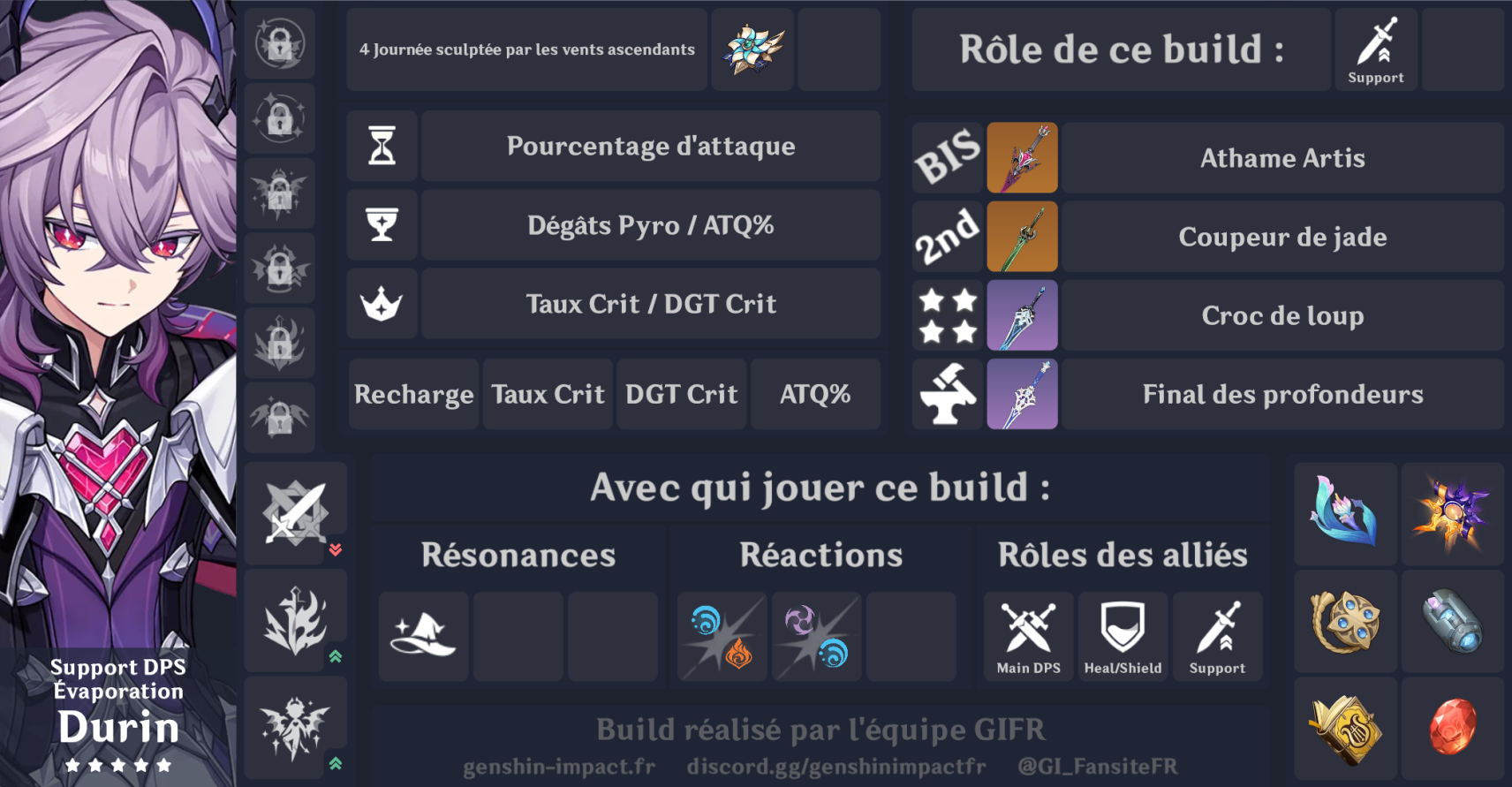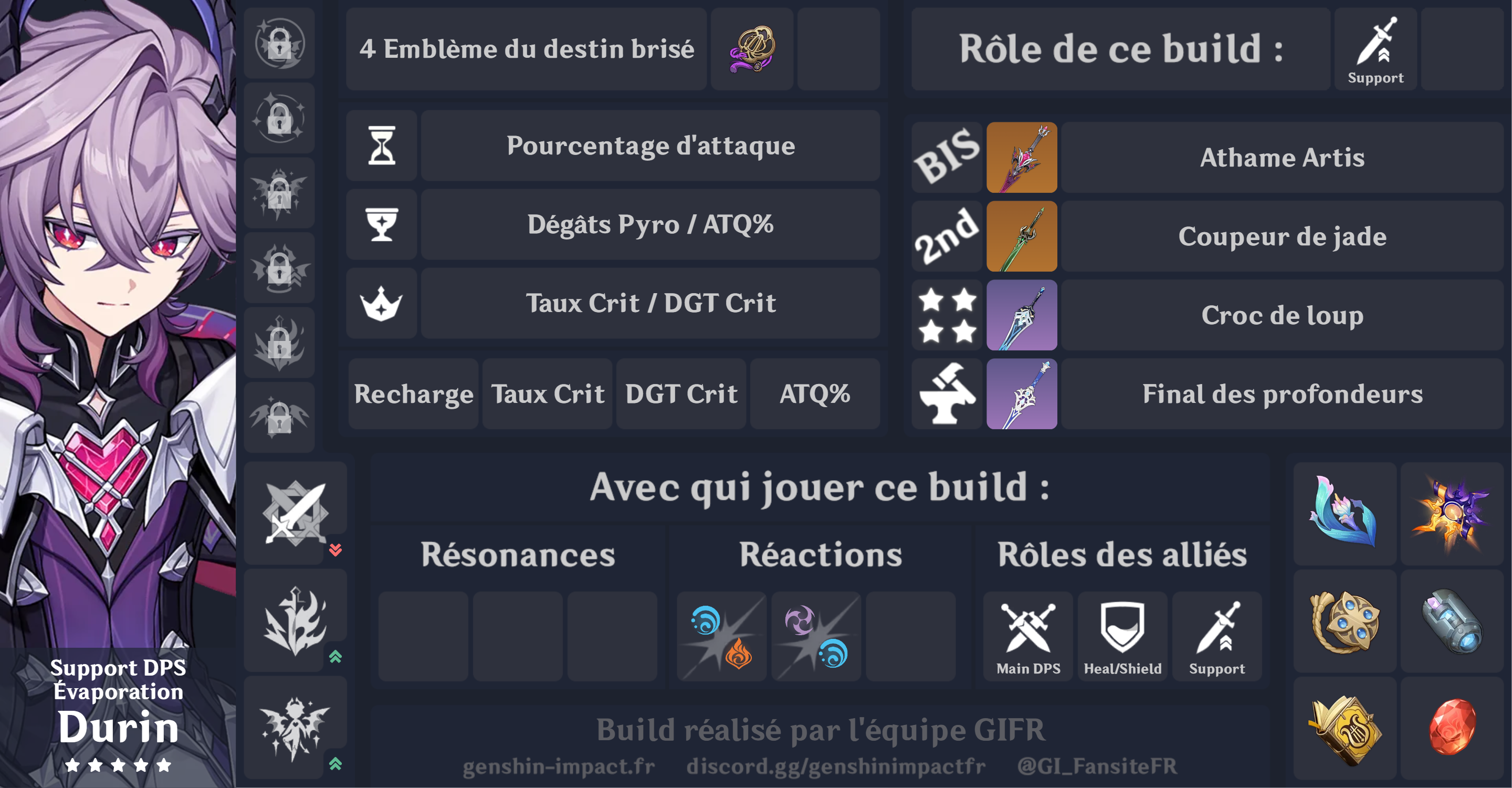 | Constellation #2 Visions sans fond | Si un personnage de l'équipe à proximité a déclenché une réaction d'Évaporation, de Fonte, de Brûlure, de Surcharge, de Dispersion Pyro ou de Cristallisation Pyro sur un ennemi, ou bien inflige des DGT Pyro ou des DGT Dendro sur un ennemi brûlé, pendant 20 s après que Durin utilise un déchaînement élémentaire, le personnage de l'équipe à proximité obtient un bonus de DGT Pyro et un bonus de DGT de l'élément impliqué dans la réaction de 50 % pendant 6 s. |