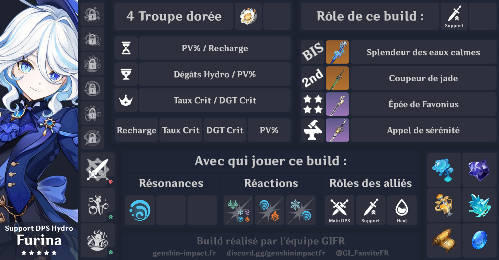 | Constellation #1 « L'amour est un oiseau rebelle que nul ne peut apprivoiser » | En utilisant Liesse populaire, Furina obtient 150 pts de fanfare. De plus, la limite de fanfare augmente de 100 pts. |