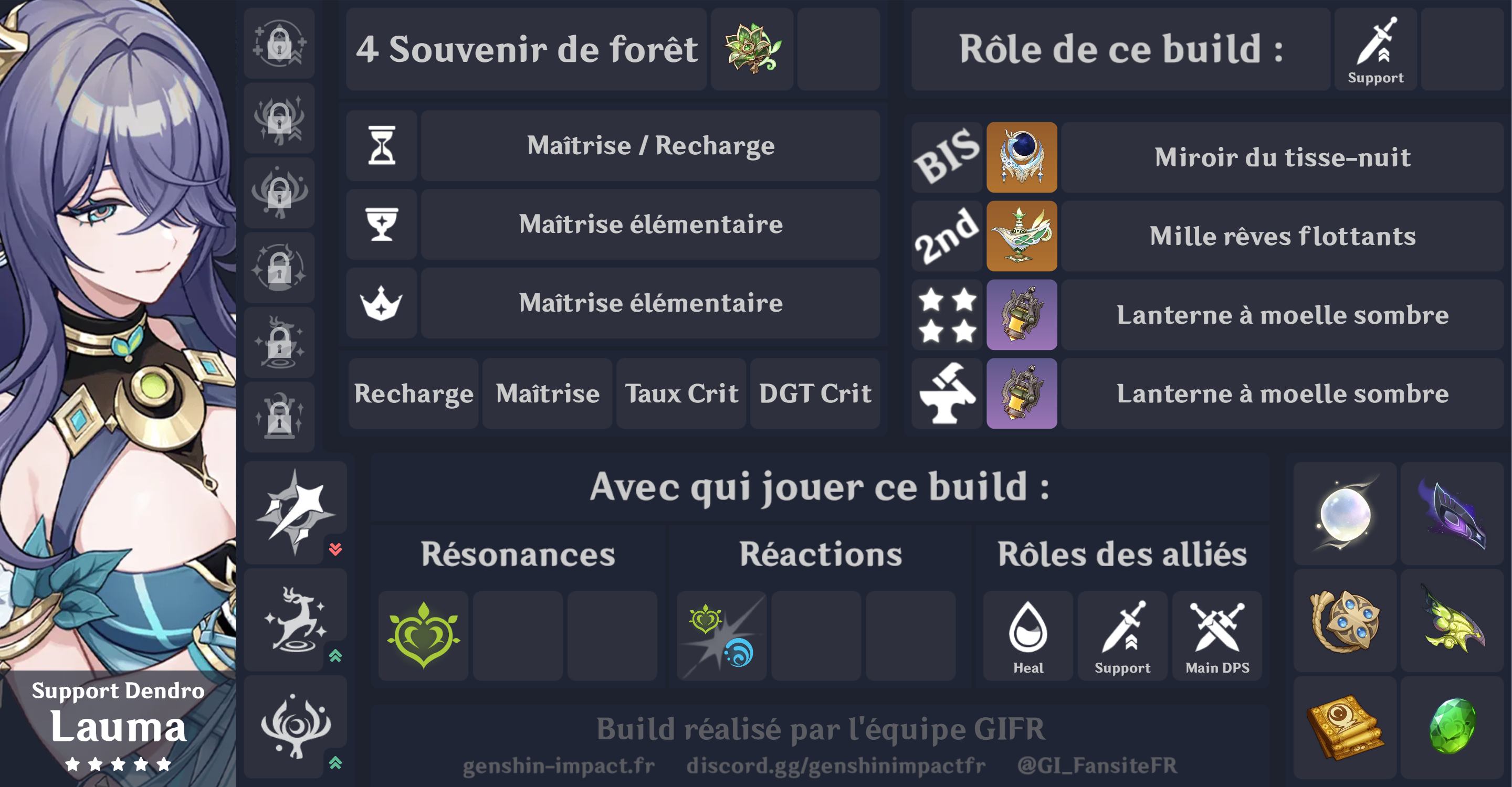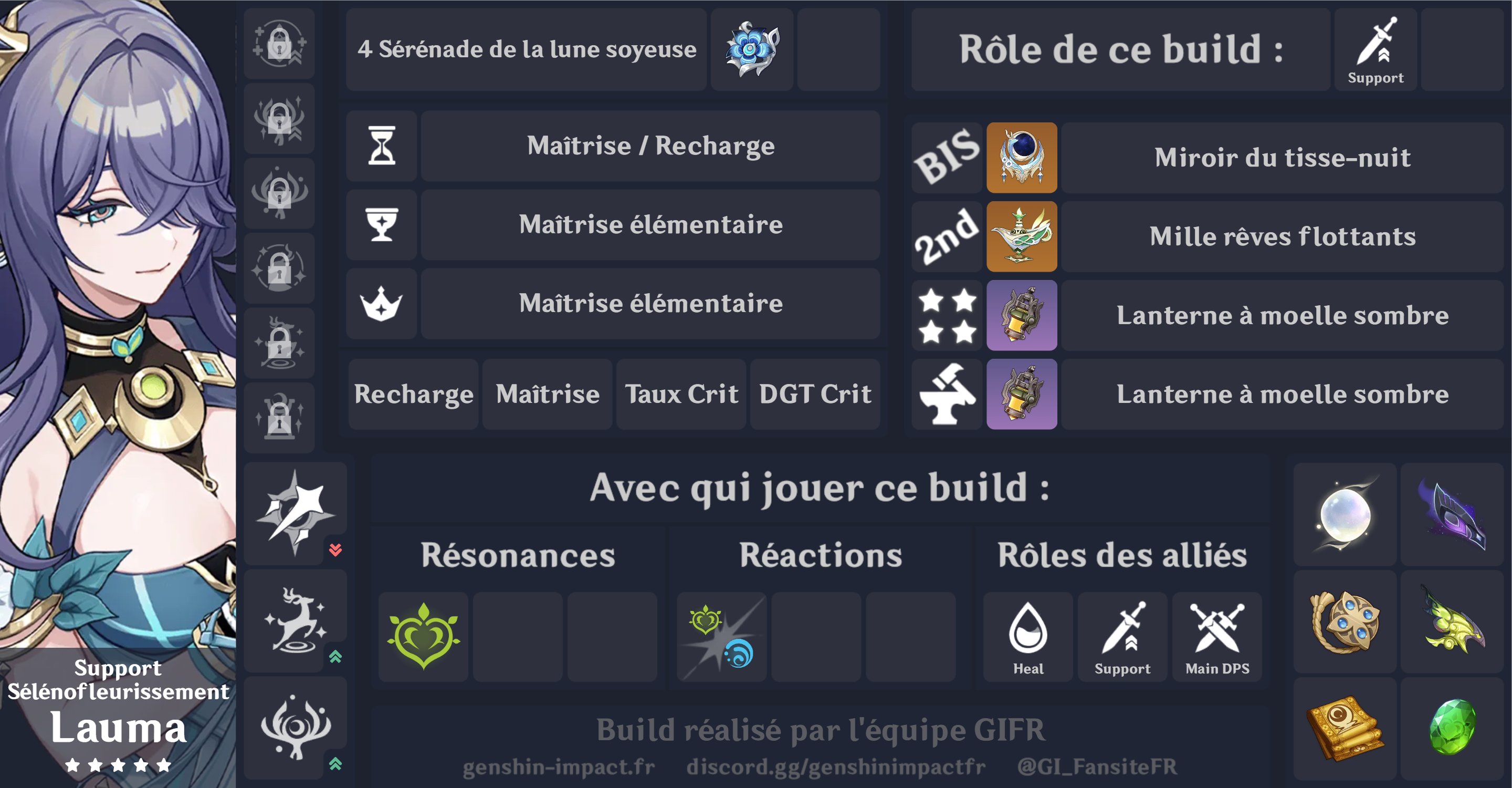 | Passif #3 Bénédiction de signelune : Chœur de la nature | Lorsqu'un personnage de l'équipe déclenche une réaction de Fleurissement, elle est convertie en réaction de Sélénofleurissement, dont les DGT de base augmentent selon la maîtrise élémentaire de Lauma : chaque point de maîtrise élémentaire augmente les DGT de base de 0,0175 %, les DGT pouvant être augmentés d'un maximum de 14 % de cette manière. De plus, la signelune de l'équipe augmente d'un niveau lorsque Lauma fait partie de l'équipe. |