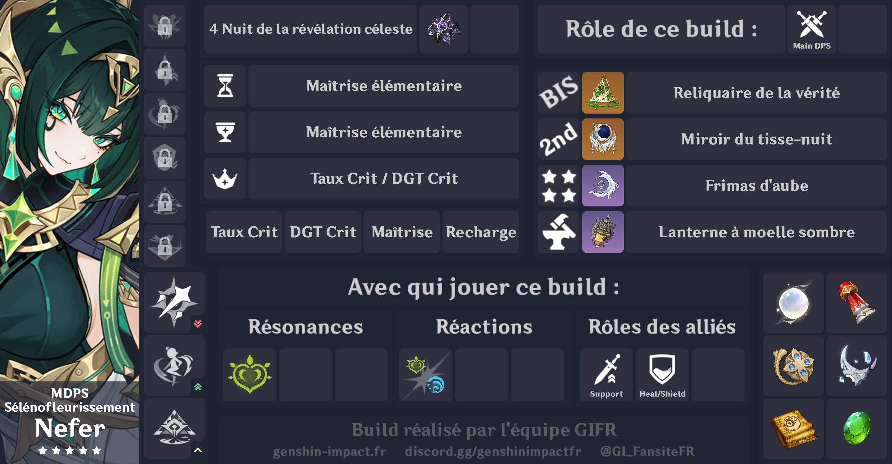 | Constellation #1 La planification engendre le succès | Les DGT de base des réactions de Sélénofleurissement déclenchées par les performances fantasmatiques de Nefer augmentent d'une valeur équivalant à 60 % de sa maîtrise élémentaire. Cet effet est également amélioré par les cumuls de voile mensonger. |