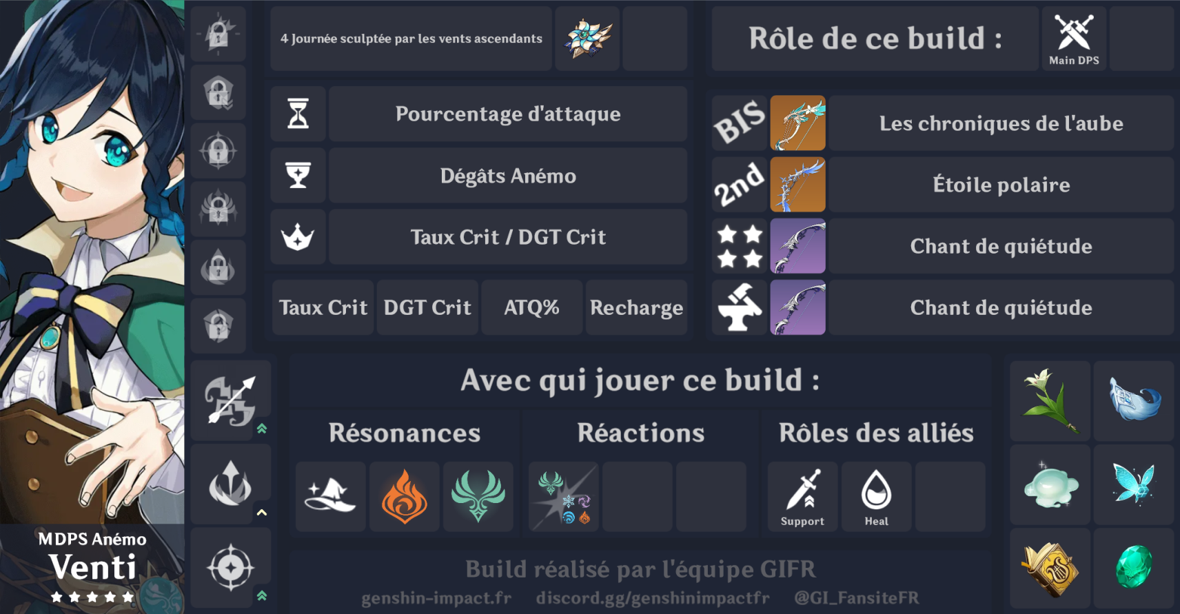 | Constellation #4 Vent glacial de liberté | Venti inflige 25 % de DGT Anémo supplémentaires pendant 10 s lorsqu'il obtient un orbe ou une particule élémentaire. Après avoir terminé le devoir de la sorcière « Du réveil du vent », l'effet est remplacé par : Après avoir utilisé sa compétence élémentaire Sonnet des vents célestes ou son déchaînement élémentaire Ode au vent, Venti et les autres personnages déployés de son équipe obtiennent un bonus de DGT Anémo de 25 % pendant 10 s. |