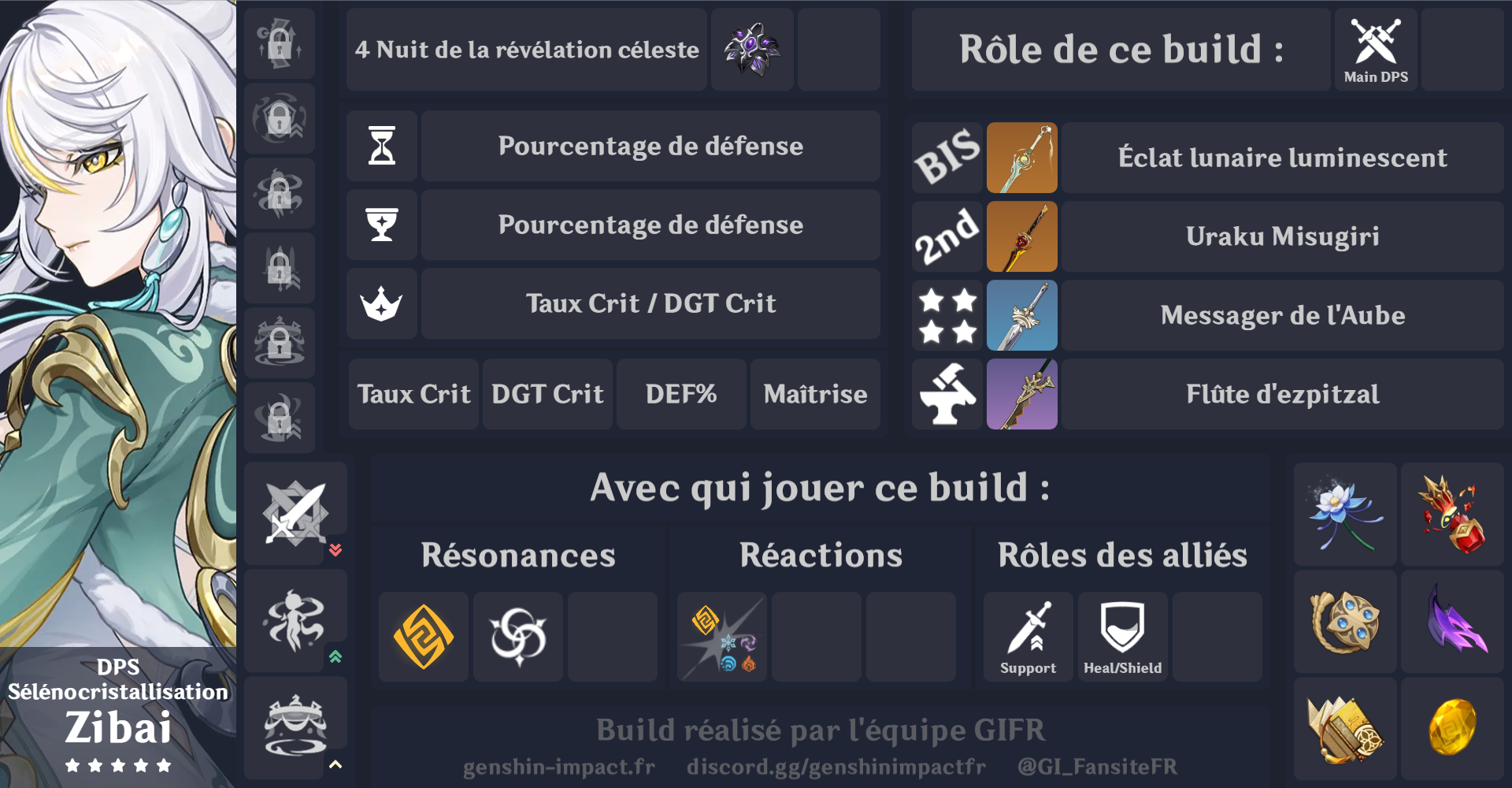 | Passif #3 Bénédiction de signelune : Soleil et lune en mouvement | 10% de chance d'obtenir le double de produits lors de la synthèse de matériaux d'élévation d'arme.Lorsqu'un personnage de l'équipe déclenche une réaction de Cristallisation Hydro, elle est convertie en réaction de Sélénocristallisation, dont les DGT de base augmentent selon la DÉF de Zibai : chaque tranche de 100 pts de DÉF augmente les DGT de base de 0,7 %, les DGT pouvant être augmentés d'un maximum de 14 % de cette manière. De plus, la signelune de l'équipe augmente d'un niveau lorsque Zibai fait partie de l'équipe. |