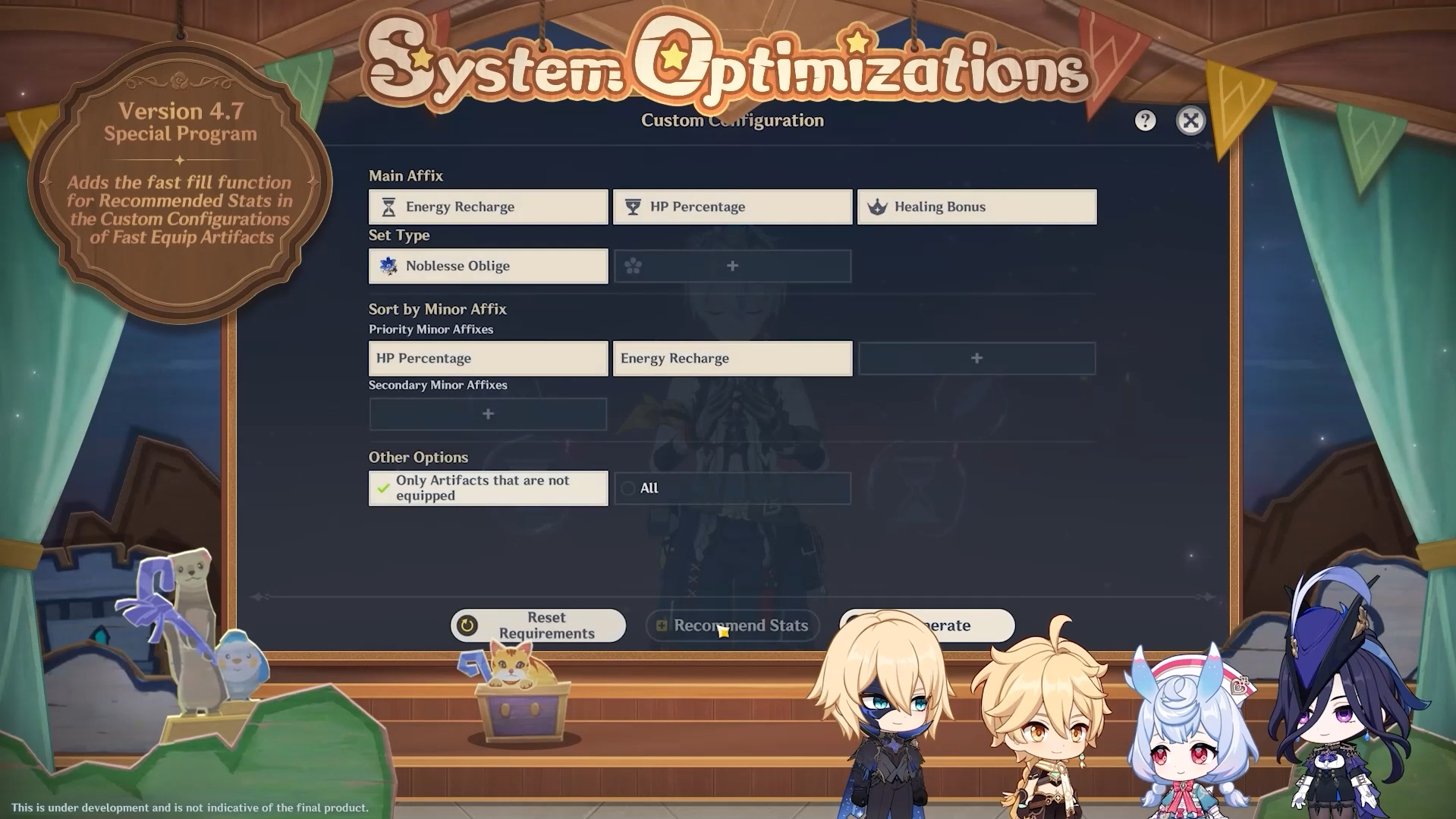 Concernant les artéfacts, une fonctionnalité « Attributs recommandés » sera ajoutée à l’interface « Équiper rapidement > Attirail personnalisé ». Cela permettra de remplir les emplacements avec des sets d’artéfacts et des attributs recommandés selon les données des joueurs actifs du jeu.