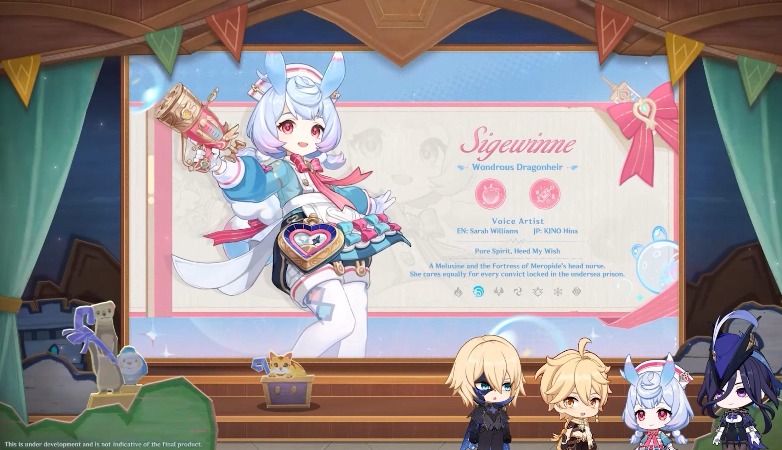 Sigewinne est une archère Hydro. Lorsqu’elle effectue un tir chargé et que la charge est terminée, Sigewinne tire des mini-délicabulles qui se déplacent lentement vers une cible pour lui infliger des dégâts Hydro.