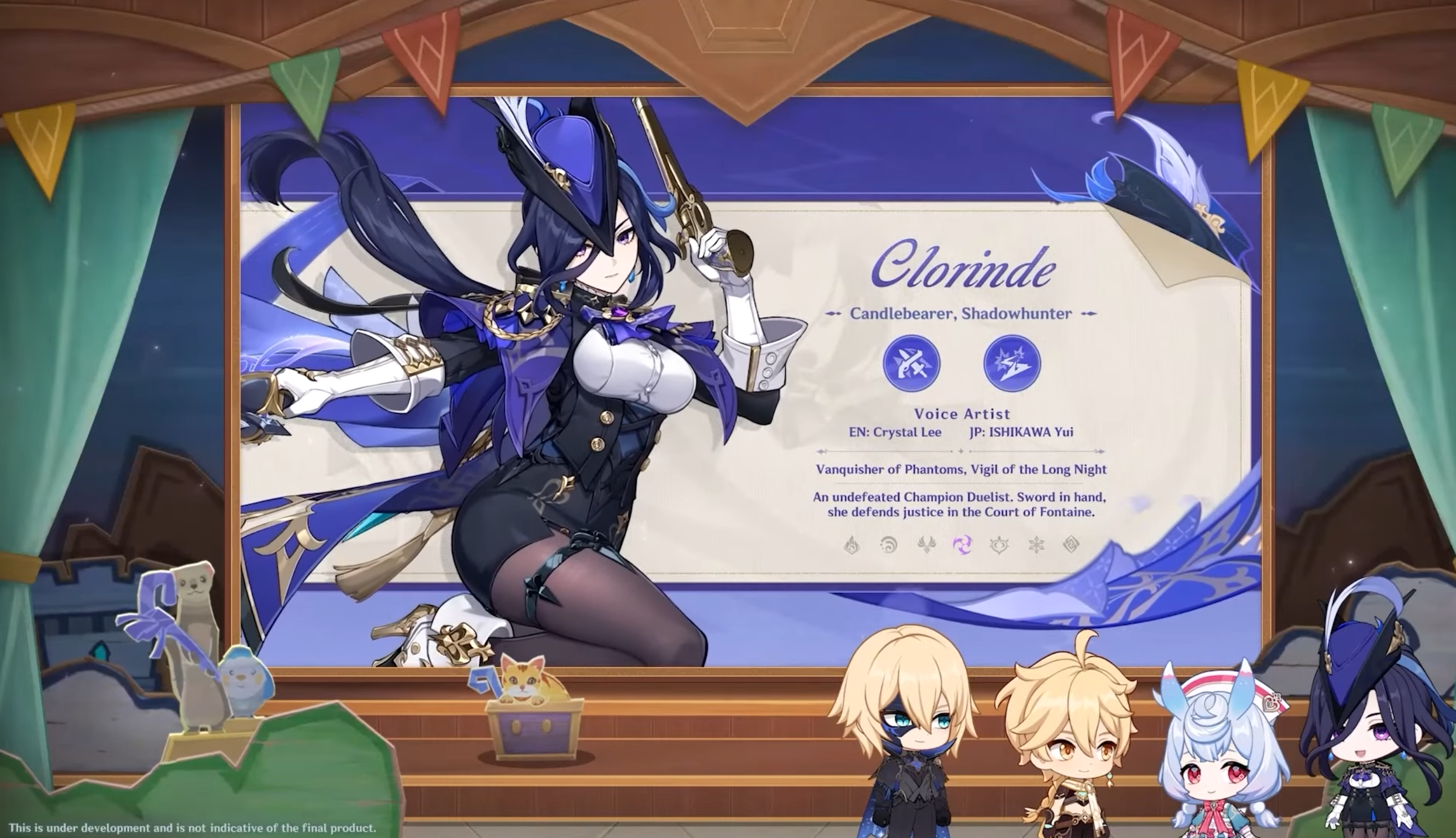 Manieuse d’épée à une main Électro, elle est aussi armée d’un pistolet. De plus, elle utilise la mécanique d’engagement vital, tout comme Arlecchino.