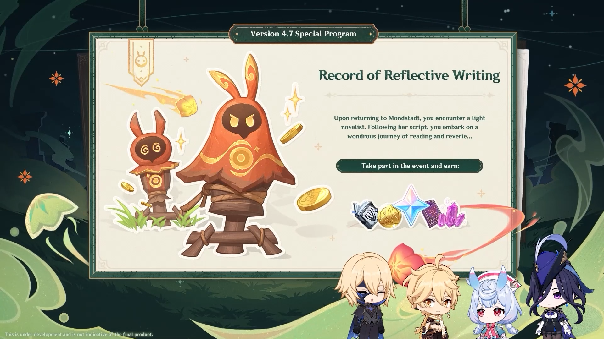 À Mondstadt, vous aurez l’occasion de retrouver un auteur de romans légers qui vient de terminer son tout nouveau manuscrit. En suivant son histoire, partez dans une aventure imaginaire qui vous mènera dans des endroits bien mystérieux et dangereux… Pour gagner des récompenses, il faudra récupérer le plus de pièces, tout en esquivant les attaques de différents mécanismes !