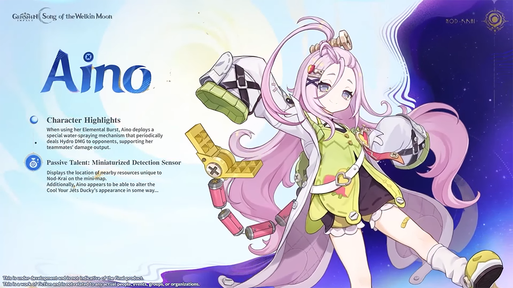 Aino sera le premier personnage Hydro utilisant une épée à 2 mains ! Elle peut utiliser sa compétence élémentaire pour se propulser en avant tout en infligeant des dégâts. Son déchaînement élémentaire invoque un petit robot qui inflige régulièrement des dégâts Hydro.