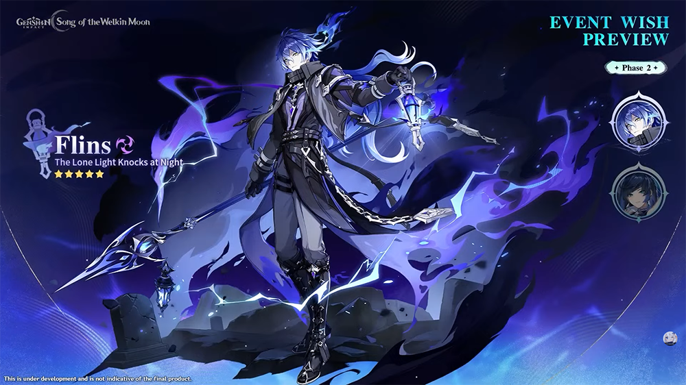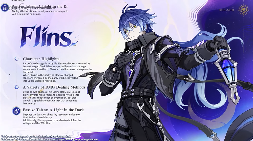 Flins est le second personnage capable d’utiliser la Sélénocution, et il s’apparente plutôt à un MDPS. Il se bat avec un lance et utilise l’élément Électro.