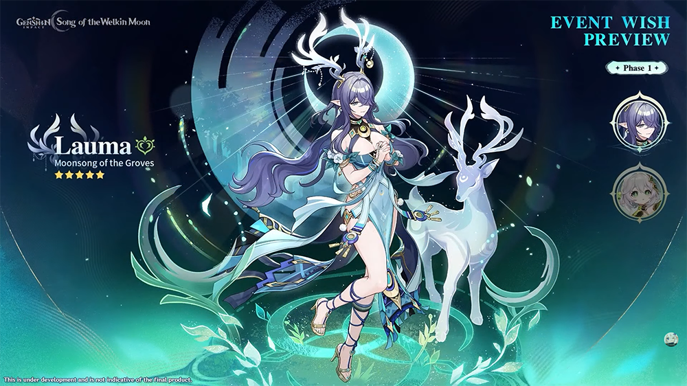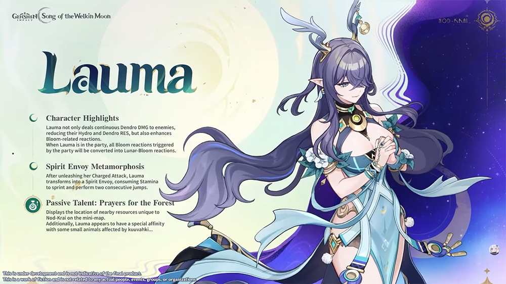 Lauma est un personnage Dendro utilisant un catalyseur. Elle amène avec elle la nouvelle réaction de Sélénofleurissement, qui permet d’obtenir de la rosée verdoyante. Cette nouvelle ressource partagée par toute l’équipe pourra apporter divers bonus.