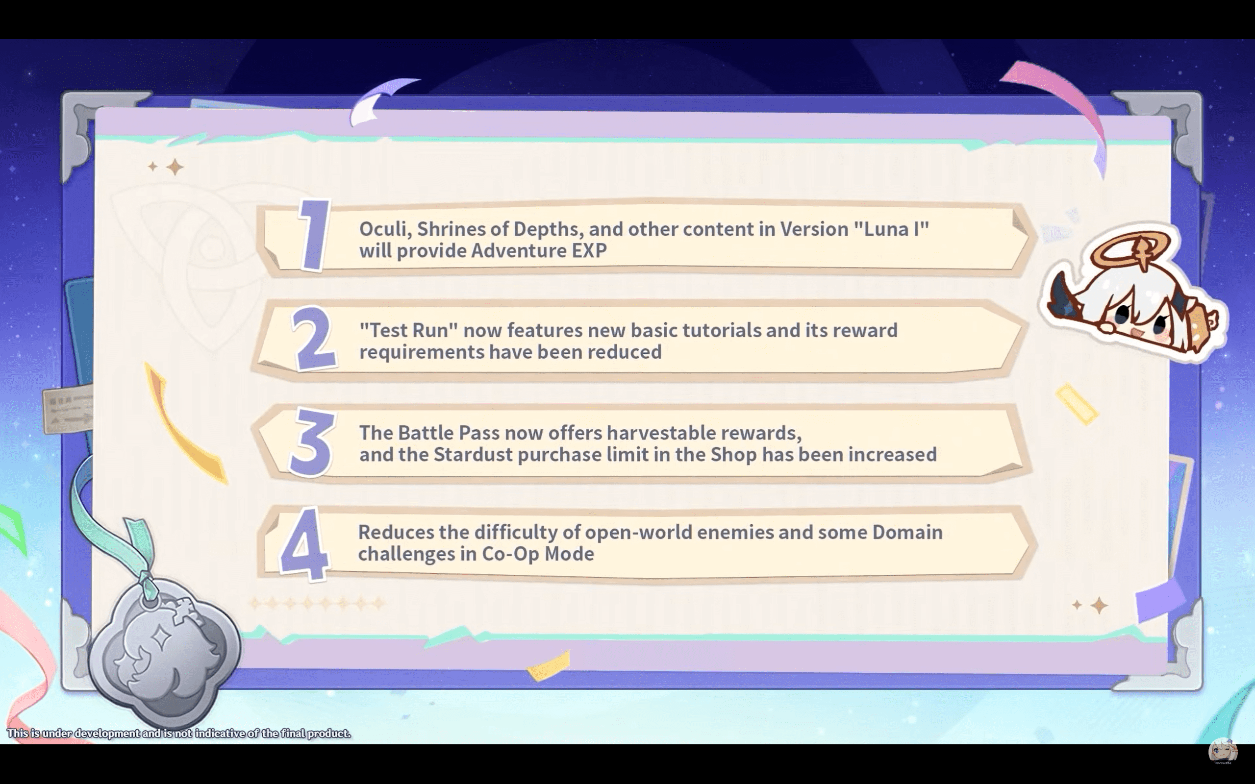 Un nouveau niveau de difficulté arrivera dans le théâtre : le mode lunaire. Celui-ci requiert entre 28 et 32 personnages remplissant les conditions d’entrée et possèdera 12 stages, au lieu des 10 du niveau précédent. À la clé, vous obtiendrez 200 primogemmes supplémentaires ainsi qu’une arcane lunaire, un nouveau collectable qui peut être échangé entre amis.