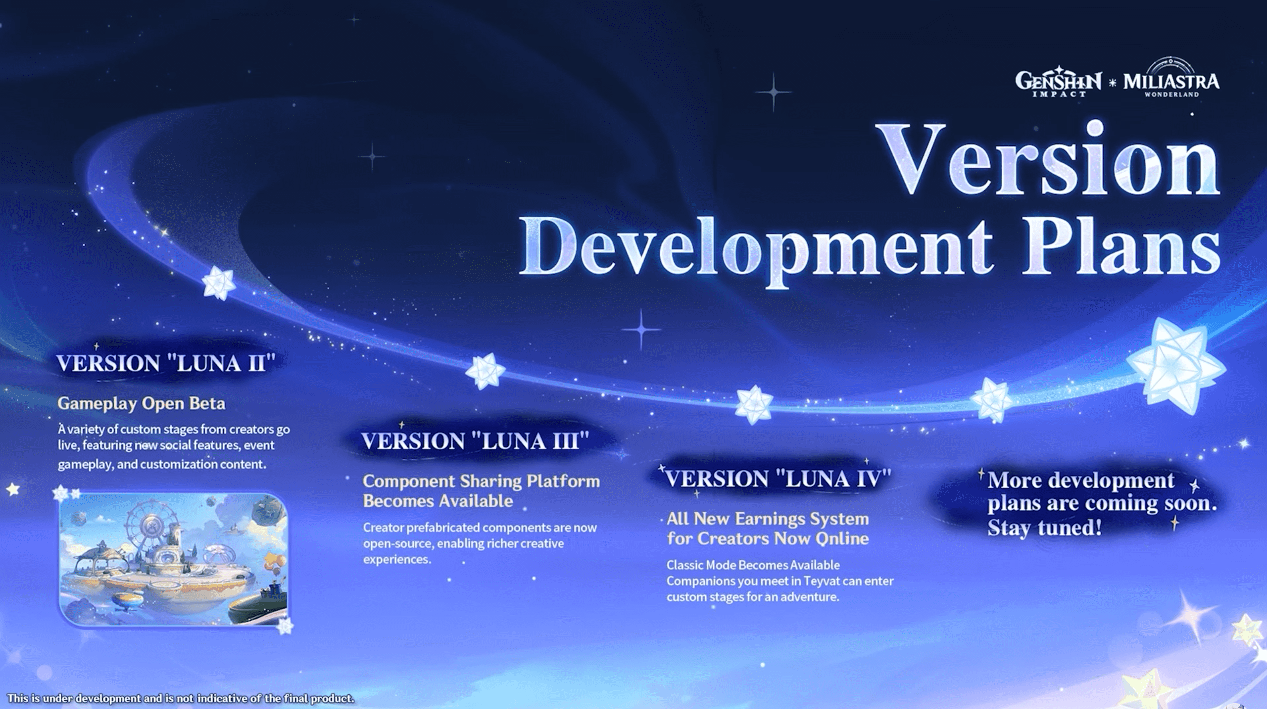 Un calendrier a été donné pour les étapes de déploiement de ce nouveau mode de jeu : une beta ouverte en version Luna II, une plateforme de partage de contenu open-source en Luna III, et un système de récompenses pour les créateurs en Luna IV.