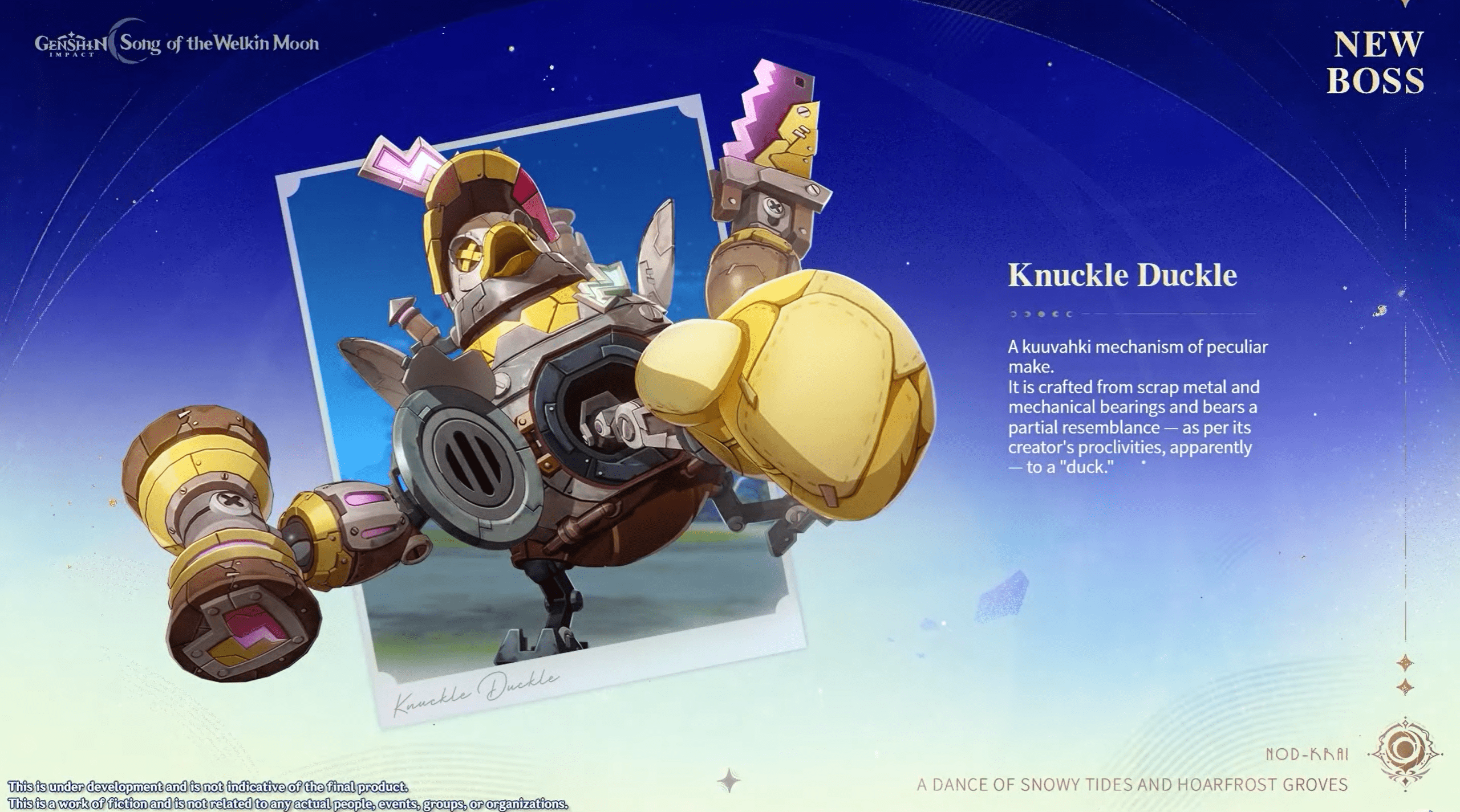 À Nod-Krai, il existe un pouvoir appelé le kuuvahki, une ancienne forme d’énergie élémentaire qui peut se diviser en des forces élémentaires distinctes. Cette énergie est notamment beaucoup utilisée pour la technologie de la région. Elle se manifeste également dans son écosystème. Utiliser ce pouvoir permettra de résoudre de nombreux défis de la région.